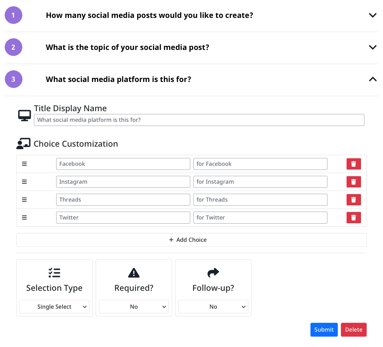 In the administration area, owners are able to construct, customize and design the prompter that best fits their users needs. Everything from prompts, choices, and selection types are adjustable.