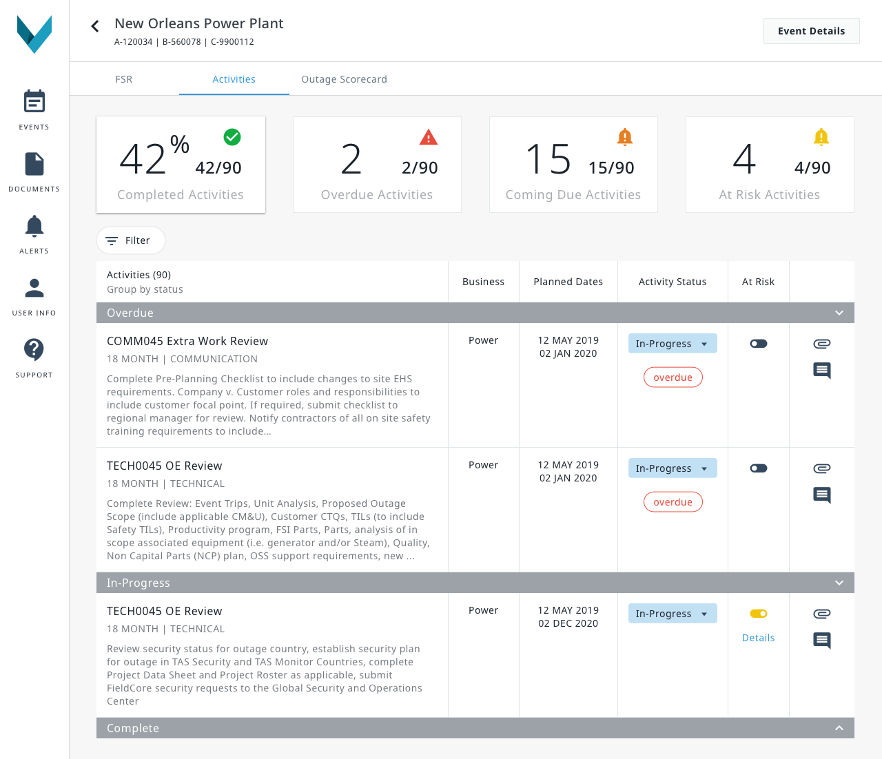 In addition to important statuses, this area also granted users access to planned date ranges, business areas, and a wide range of interactive features. These interactions encompassed the ability to update activity progress statuses, download attachments, leave comments, and flag activities at risk.